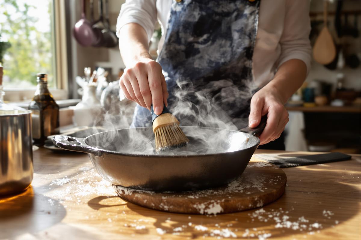 Der Schlüssel zur Rettung heißt: Neues Einbrennen (auch „seasoning“ genannt). Dabei brennst du eine neue Schutzschicht aus Öl in die Pfanne ein – so entsteht eine natürliche Antihaftbeschichtung.